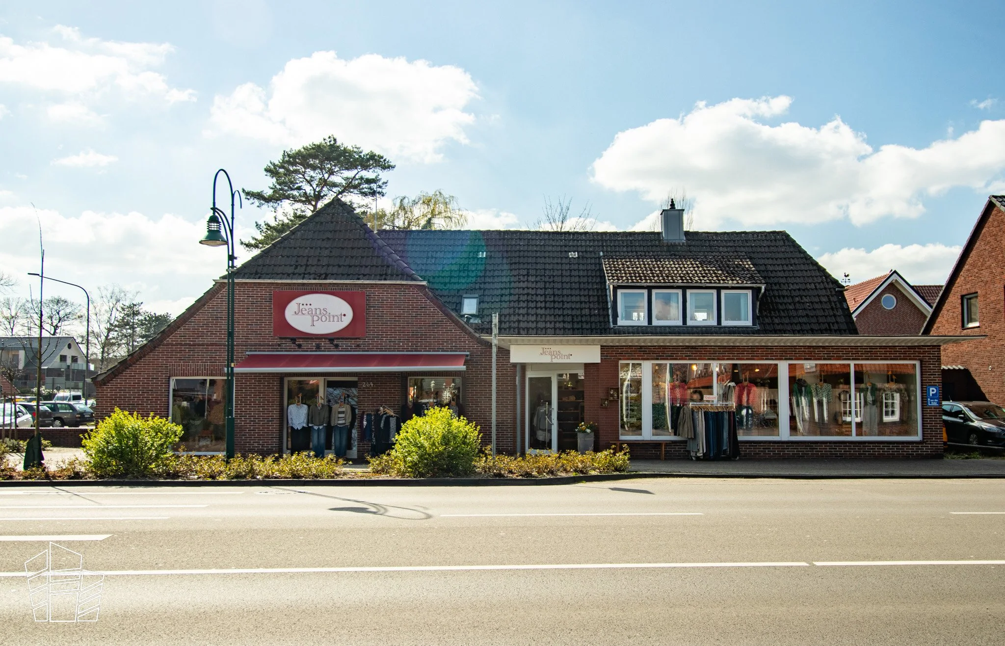 Das Wohn- und Geschäftshaus „Wardenburger Eck“ wurde in der für die Region typischen Klinkermassivbauweise mit charakteristischem Schopfwalmdach errichtet.
